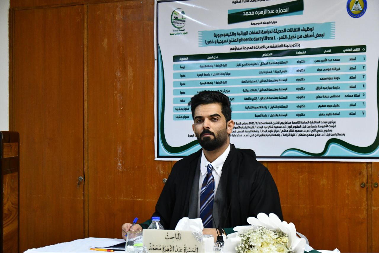 بحثت اطروحة الدكتوراة في كلية الزراعة بجامعة البصرة عن "توظيف التقانات الحديثة لدراسة الصفات الوراثية و الكيموحيوية لبعض أصناف من نخيل التمورالمنتج نسيجياً و خضرياً " .