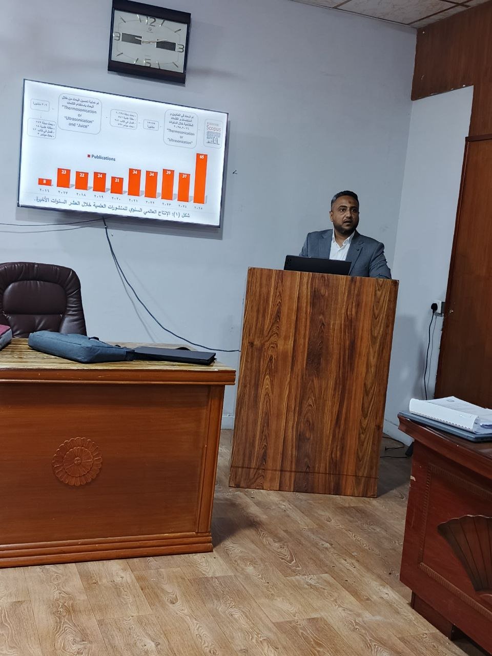 نظمت كلية الزراعة في جامعة البصرة حلقة نقاشية عن "تأثير تطبيقات الموجات فوق الصوتية الحرارية المستمرة علـى الخصائص الفيزيوكيميائية والميكروبية والحسية لبعض أنواع العصائر" .
