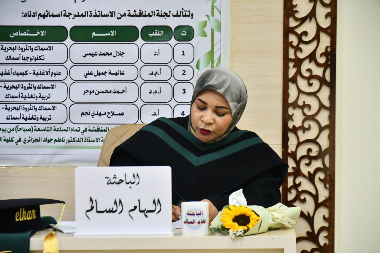 بحثت رسالة ماجستير في كلية الزراعة في جامعة البصرة بعنوان " تأثير أغشية الكولاجين المتحلل جزئياً في الصفات الكيميائية والنوعية لأسماك الحاسوم المخزونة بالتجميد".
