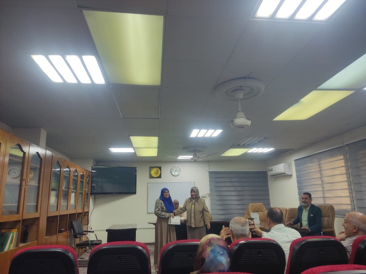 وفي ختام الحفل، قُدمت للسيدة فردوس عبد الكريم مجموعة من الهدايا التذكارية، شكر وامتنان من أسرة القسم، مع الأمنيات لها بدوام الصحة والعطاء، والاستمرار في تميزها المهني خدمةً للقسم والمؤسسة.