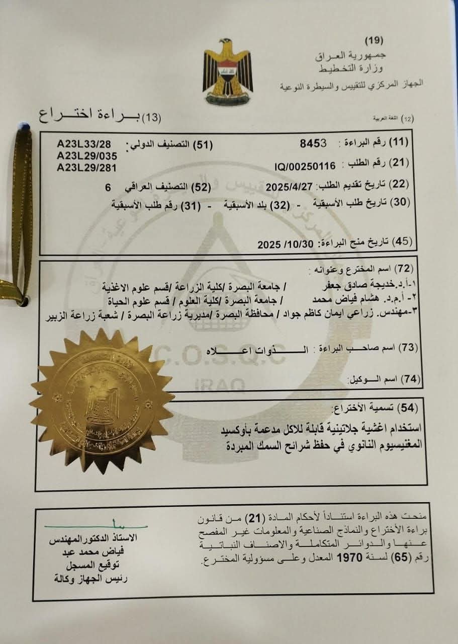 حصلت التدريسية في كلية الزراعة بجامعة البصرة الأستاذ الدكتور خديجة صادق جعفر على براءة اختراع لتمكنها من حفظ شرائح السمك المبردة بواسطة اغشية جيلاتينة قابلة للأكل مدعمة باوكسيد المغنسيوم النانوي .