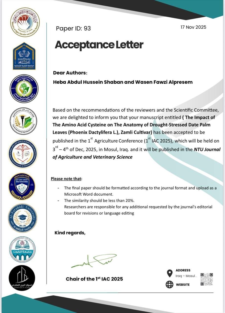 وقدمت الدكتورة خلال جلسات المؤتمر بحثها العلمي الموسوم (دور الحامض الأميني السيستين في التغيرات التشريحية لأوراق نخيل التمر صنف الزاملي تحت ظروف إجهاد الجفاف )وذلك ضمن محاور المؤتمر العلمية.