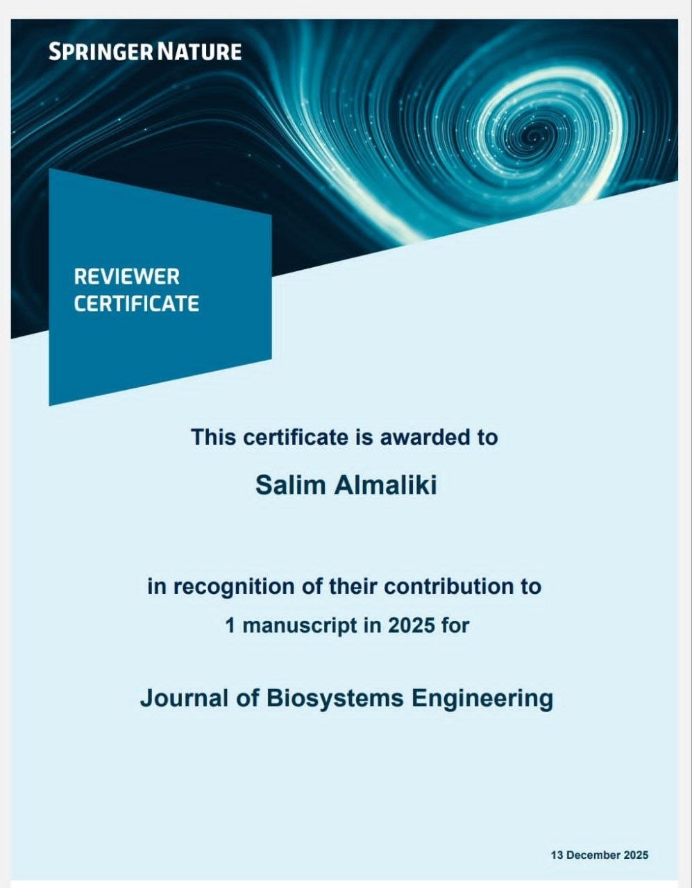 اختير تدريسي من كلية الزراعة في جامعة البصرة الأستاذ الدكتور سالم عجر بندر، ليكون مقيّمًا علميًا للمجلة العالمية "هندسة النظم الحيوية".