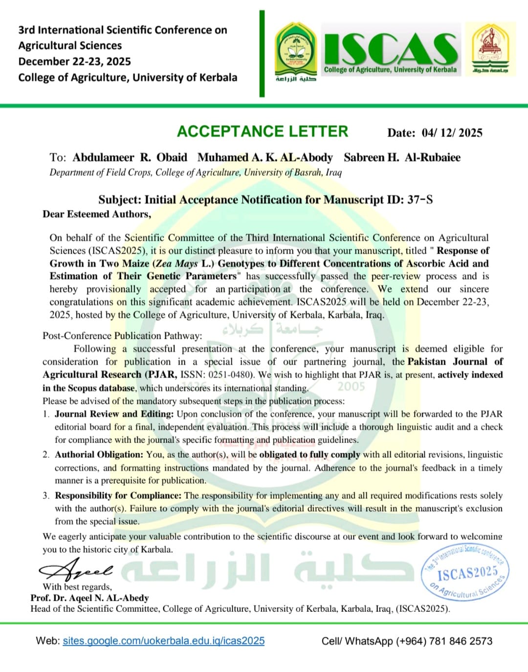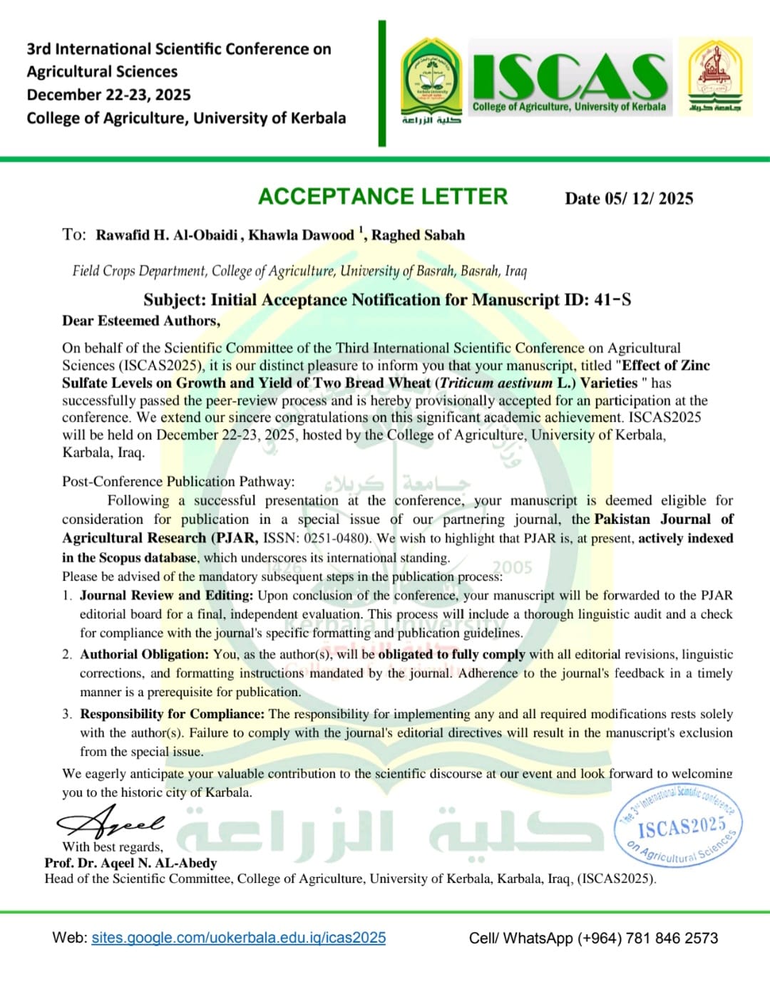 شاركت نخبة من أساتذة قسم المحاصيل الحقلية في كلية الزراعة بجامعة البصرة، في فعاليات المؤتمر العلمي الدولي الثالث للعلوم الزراعية، الذي نظمته كلية الزراعة بجامعة كربلاء للفترة من 22 إلى 23 كانون الأول 2025، تحت شعار «دور الزراعة المستدامة في مواجهة تحديات المناخ وتعزيز الأمن الغذائي».