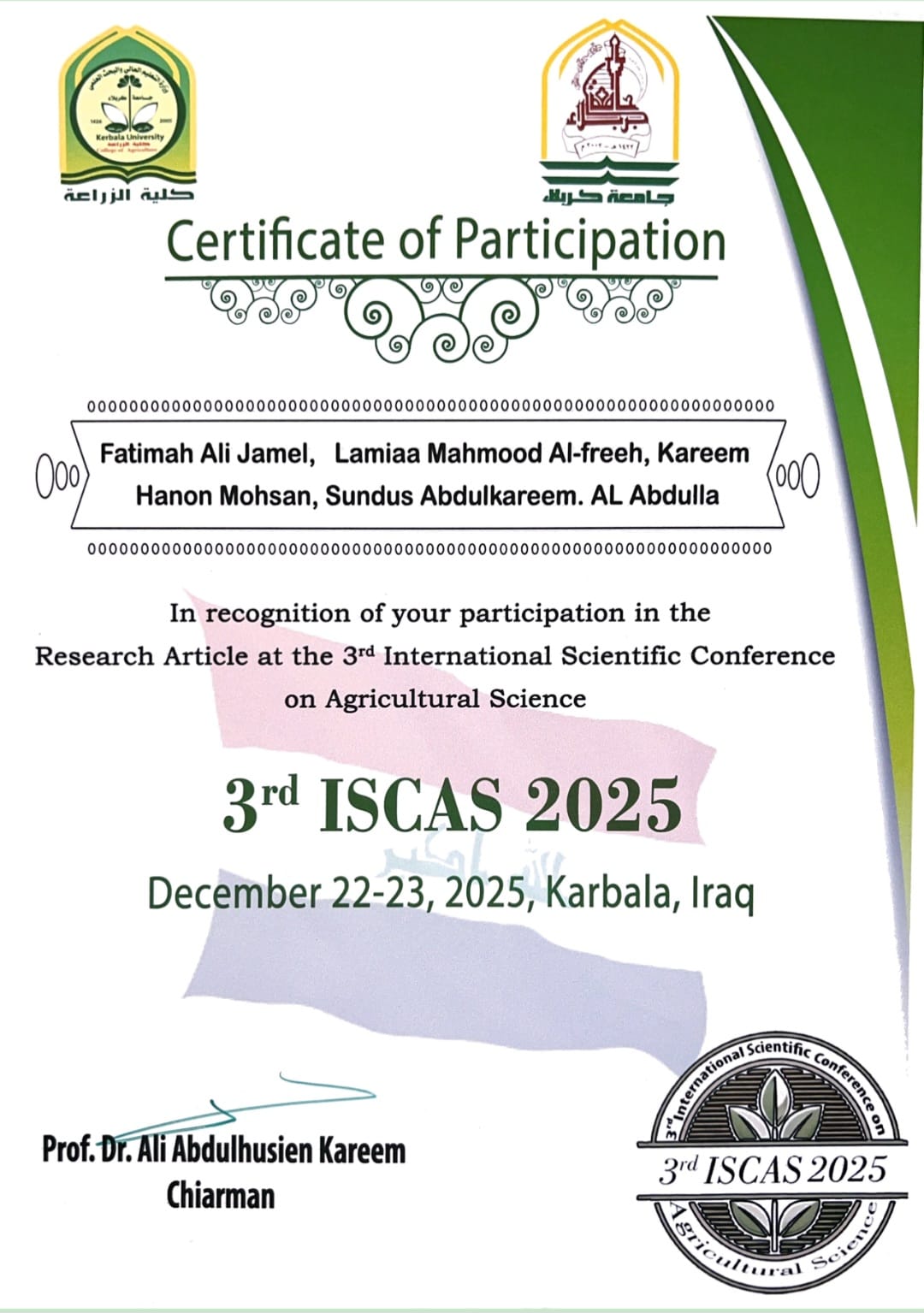تضمنت المشاركة تقديم مجموعة من البحوث العلمية الرصينة ضمن محور الزراعة المستدامة، والتي ركزت على إيجاد حلول علمية وعملية لمواجهة التغيرات المناخية وضمان استدامة الموارد الغذائية، وقد مثل الكلية في هذا المحفل الدولي كل من الدكتورة سندس عبد الكريم محمد والدكتورة لمياء محمود سلمان و الدكتورة روافد هادي قاسم و الدكتور عبد الأمير رحيم عبيد و الدكتورة صابرين حازم عبد الواحد.