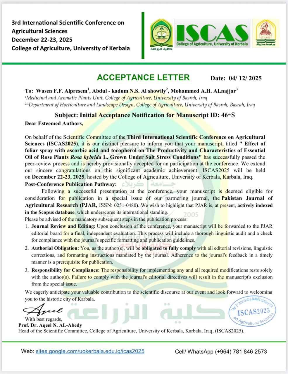 وتضمنت المشاركة القاء بحث بحث بعنوان " تأثير بعض المعاملات في إنتاجية وصفات الزيت العطري لنبات الورد الشجيري النامي تحت ظروف الإجهاد الملحي".