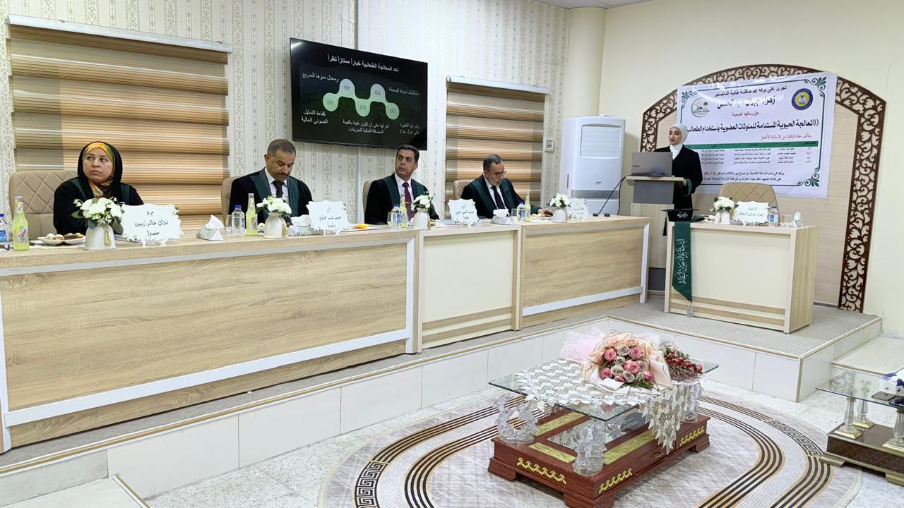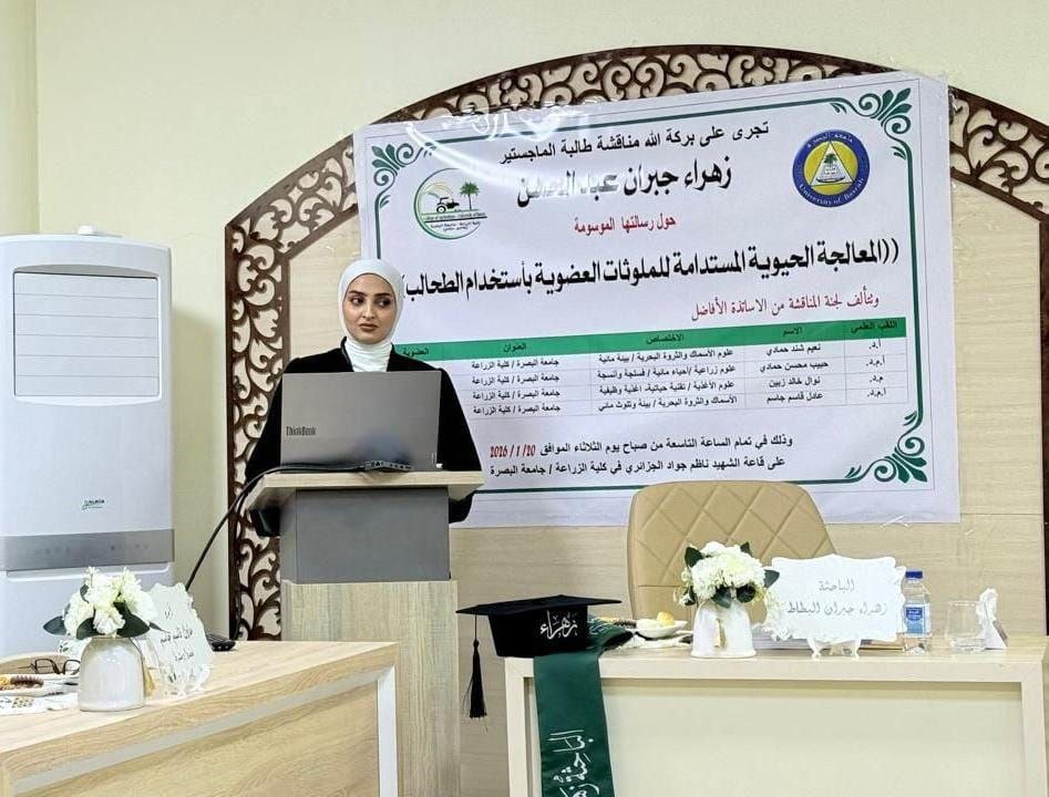 وهدفت الرسالة التي قدمتها طالبة الماجستير زهراء جبران عبد الحسن ، إلى تقييم كفاءة بعض أنواع الطحالب في إزالة الملوثات العضوية من المياه الملوثة ومياه الصرف الصحي تحت الظروف المختبرية، إضافة إلى قدرتها على إزالة المغذيات الرئيسة.
