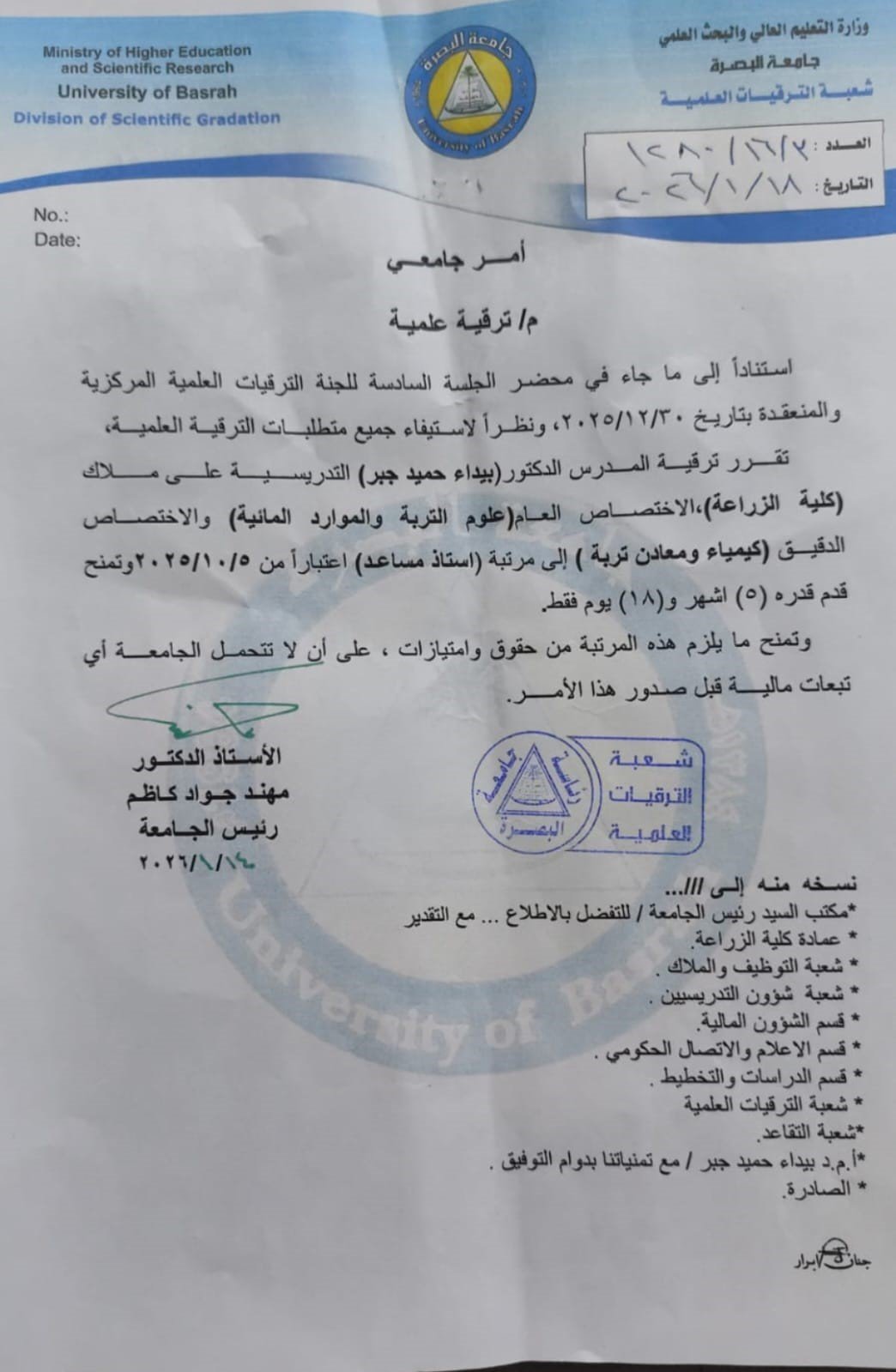 حصلت المدرس الدكتور بيداء حميد جبر في قسم علوم التربة والموارد المائية في كلية الزراعة / جامعة البصره، على لقب استاذ مساعد ، وقد منحت اللقب العلمي بعد استيفاء كافه متطلبات الترقية العلمية المنصوص عليها في قانون الترقيات.