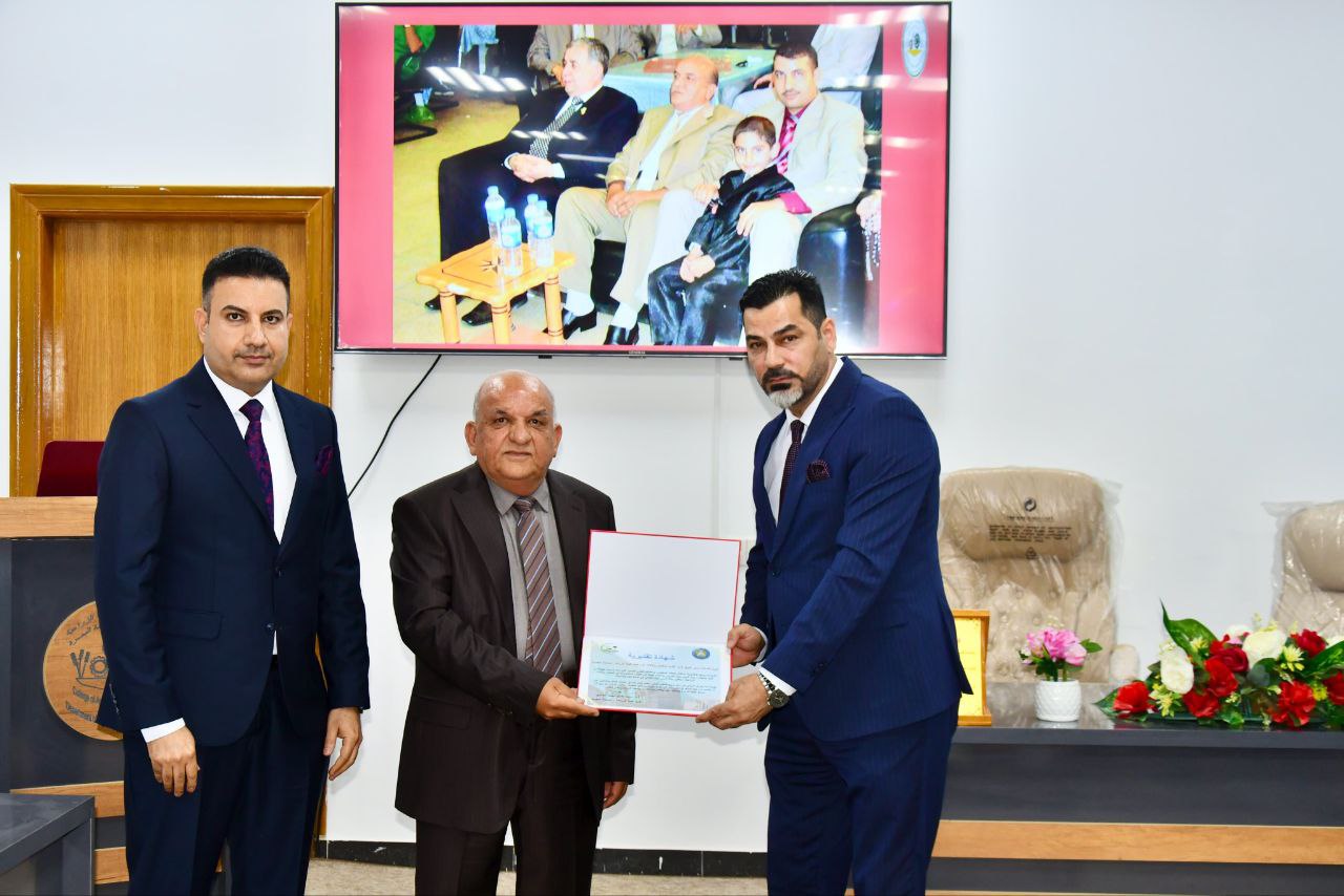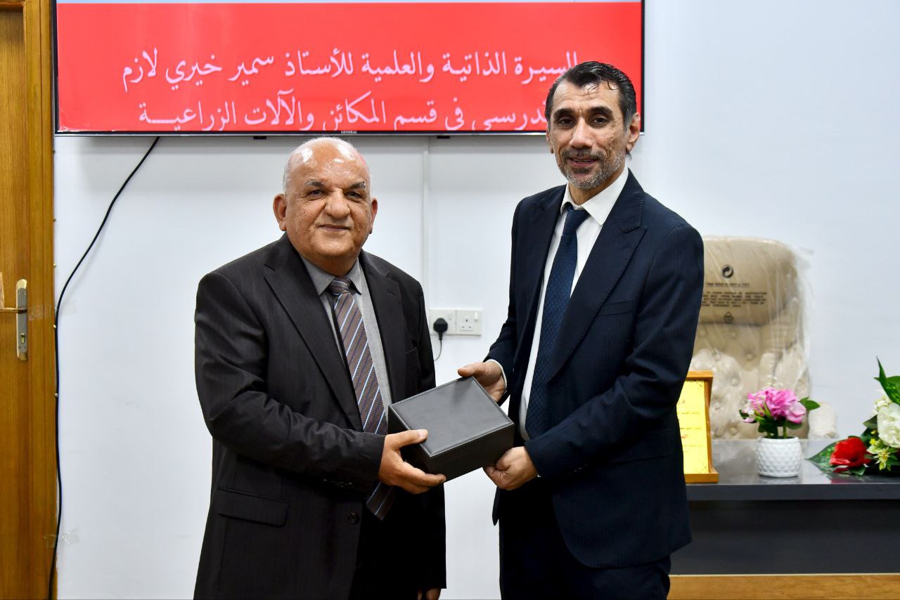 شرف الحفل بحضوره السيد عميد كلية الزراعة الاستاذ الدكتور سرمد غازي محمد الشاوي ، والسادة المعاونين العلمي والاداري ورئيس قسم المكائن والالات الزراعية وعدد من السادة رؤساء الأقسام، ونخبة من أعضاء الهيئة التدريسية والمنتسبين.