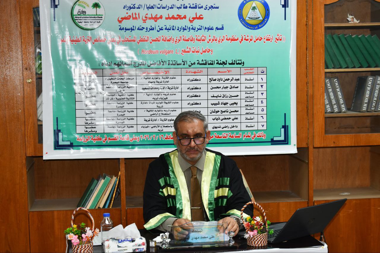 بحثت أطروحة دكتوراه في كلية الزراعة بجامعة البصرة عن "دراسة تاثير ارتفاع حامل المرشة في منظومة الري بالرش الثابتة وفاصلة الري واضافة المحسن النفطي المستحلب في بعض خصائص التربة الطينية ونمو وحاصل نبات الشعير Hordeum vulgare L".