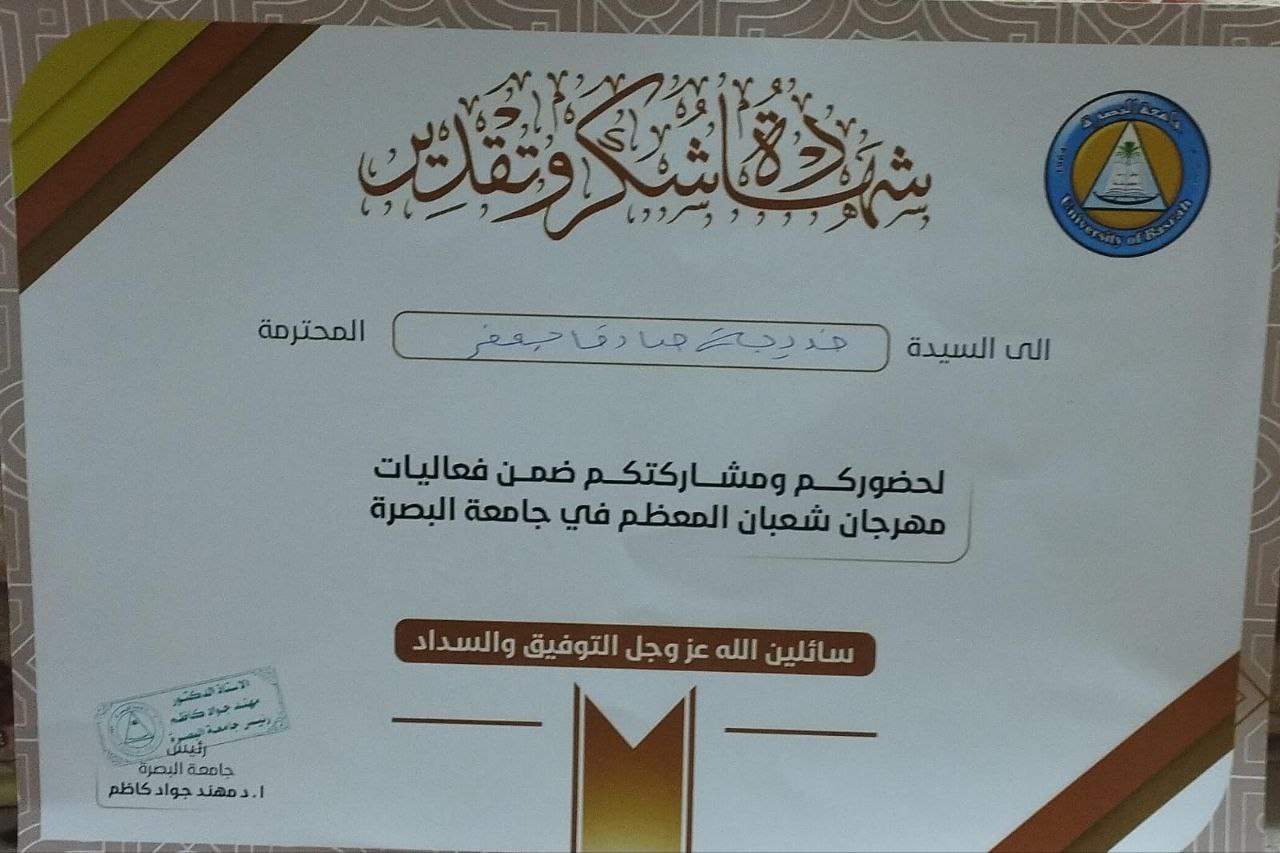 كرمت رئاسة جامعة البصرة، التدريسية في كلية الزراعة بجامعة البصرة الدكتورة خديجة صادق جعفر ، بمنحها شهادة شكر وتقدير، وذلك تقديراً لمشاركتها الفاعلة وبصمتها العلمية المتميزة خلال فعاليات مهرجان شعبان المعظم الذي أقيم في رحاب الجامعة.