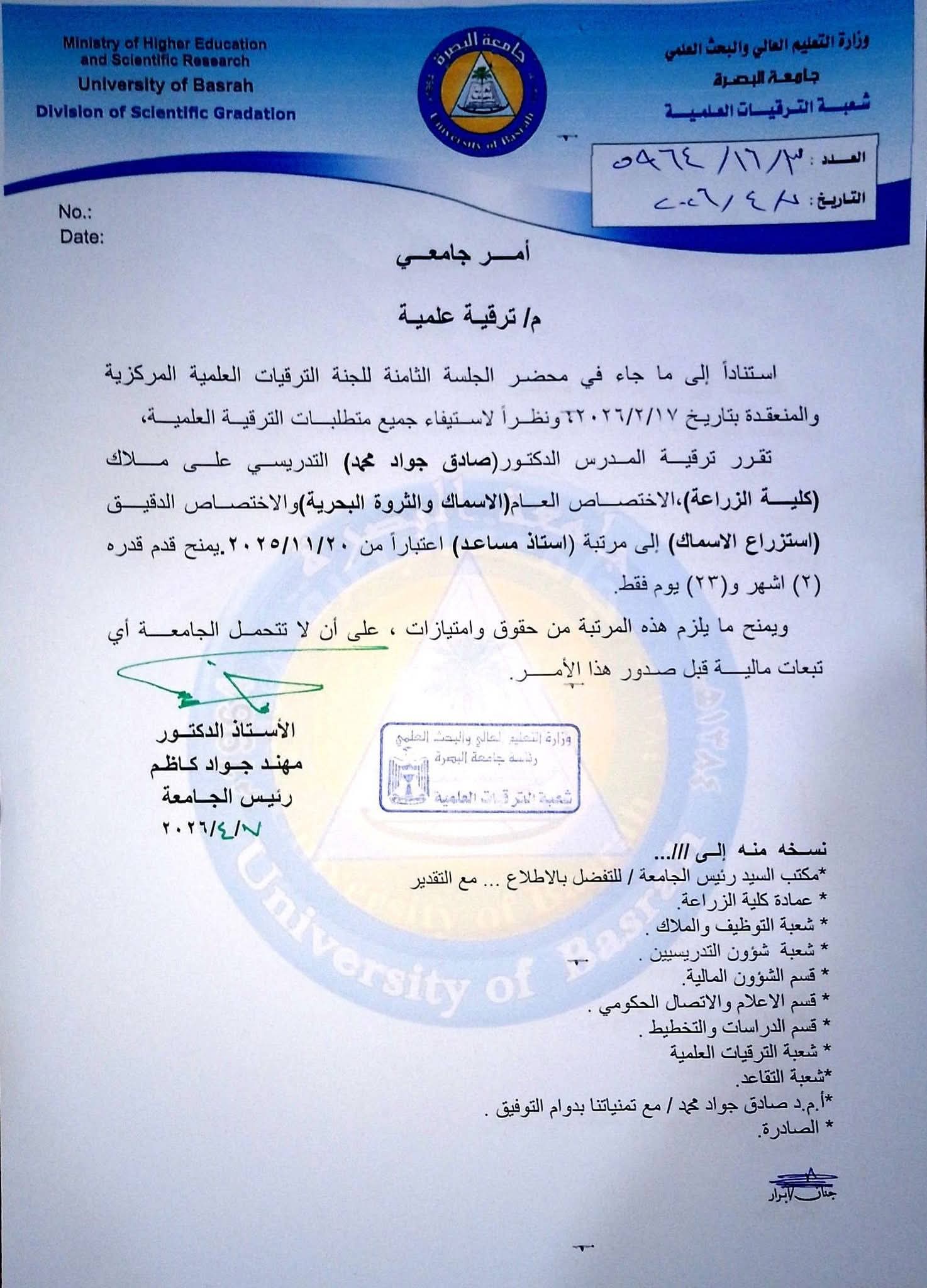 حصل المدرس الدكتورصادق جواد محمد في قسم الاسماك والثروة البحرية في كلية الزراعة / جامعة البصرة ، على لقب استاذ مساعد ، وقد منح اللقب العلمي بعد استيفاء كافه متطلبات الترقية العلمية المنصوص عليها في قانون الترقيات.