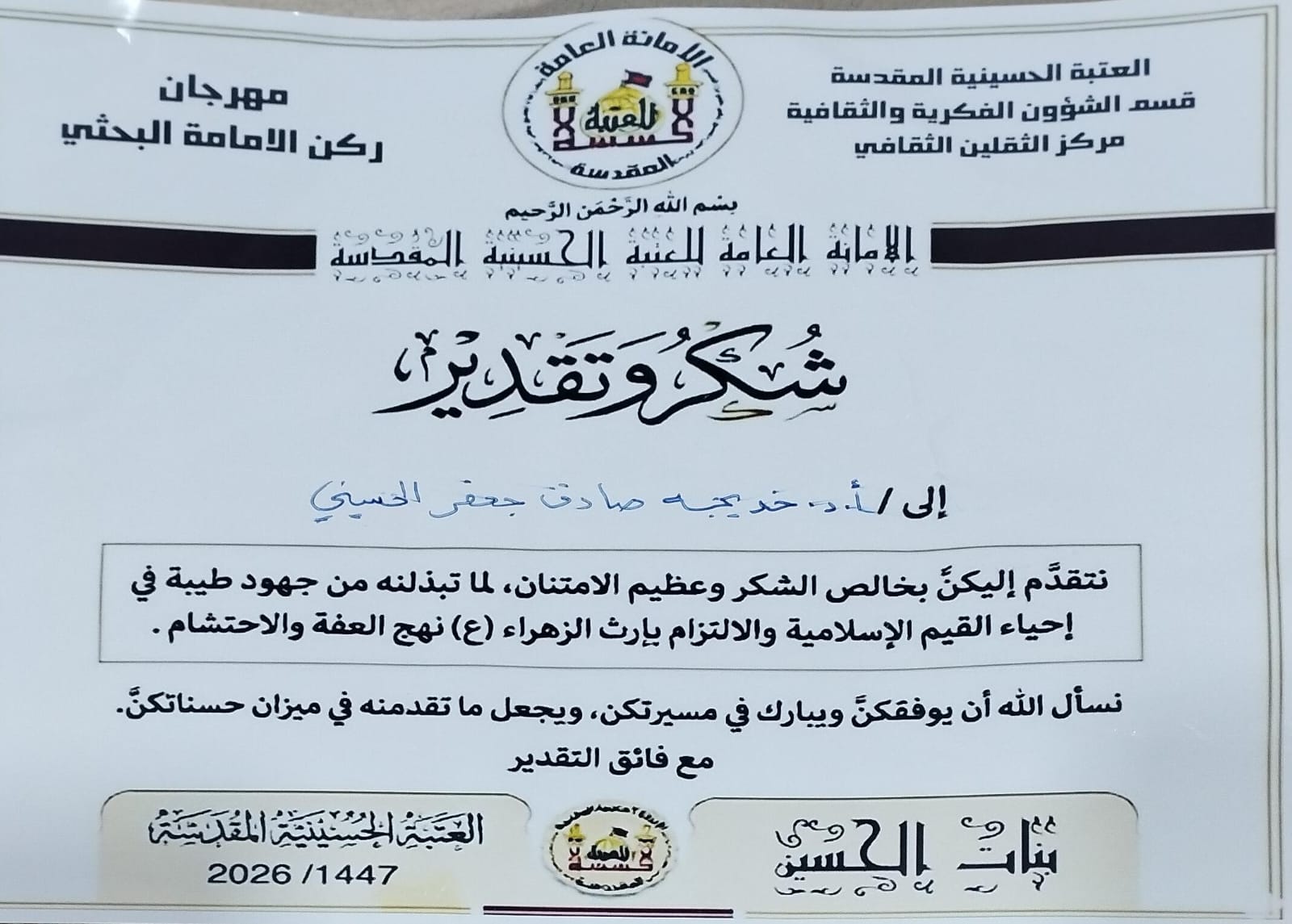 حيث قدمت بحثًا بعنوان «الإمام علي عليه السلام ـ شخصية عابرة للعصور: دراسة وفق منهج مقارن معاصر»، تناولت فيه الأبعاد الفكرية والأخلاقية لشخصية الإمام علي بن أبي طالب ودورها المتجدد في الفكر الإنساني والسياسي.