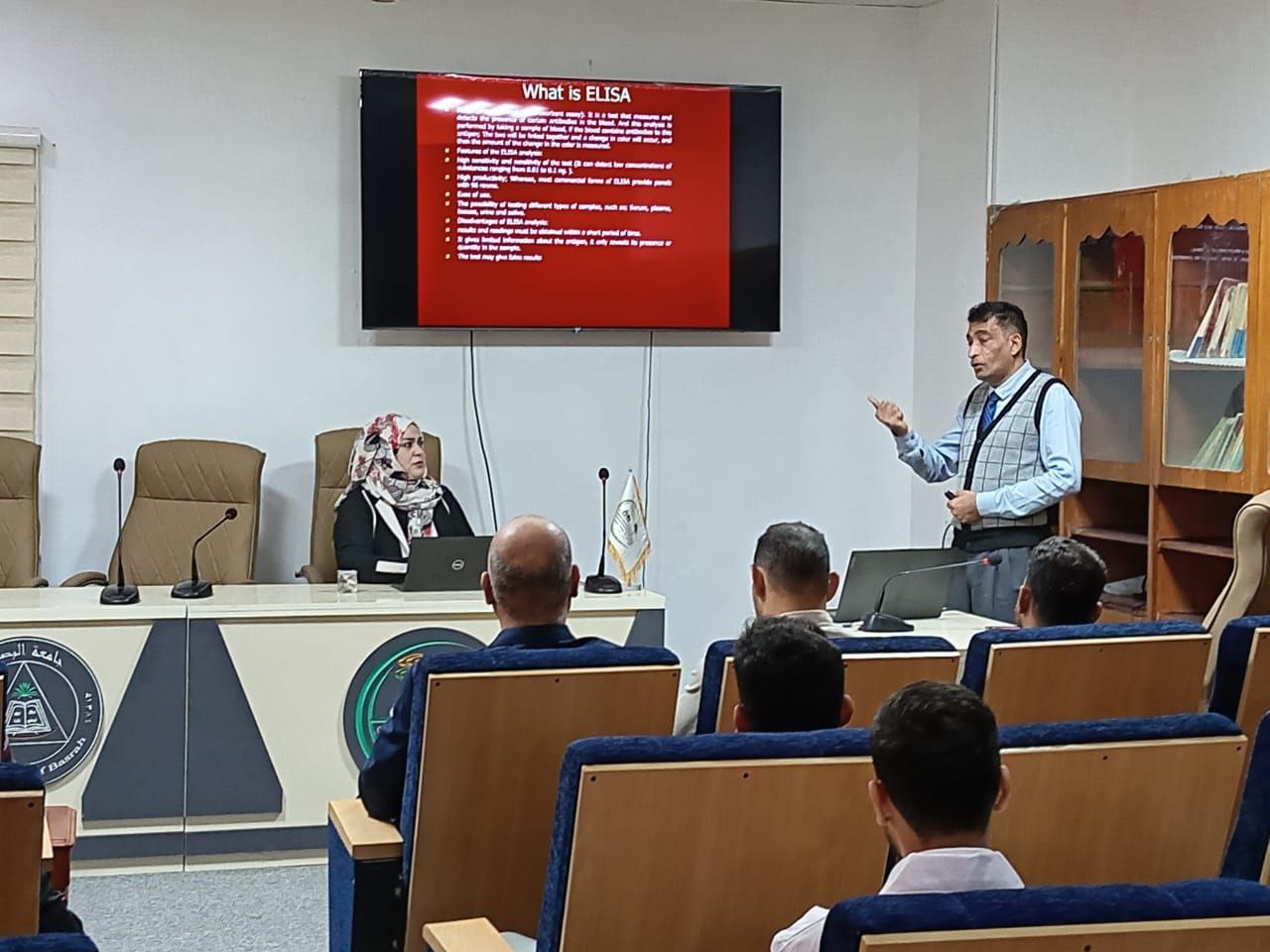 تضمّنت الدورة محاضرة الدكتور وليد يوسف قاسم ، قدّم فيها شرحاً لأحد أهم الأجهزة المستخدمة في بحوث طلبة الدراسات العليا وهو جهاز الـيزا ELISA، مبيناً أهم الفحوصات التي يوفرها ودورها في تحليل العينات.