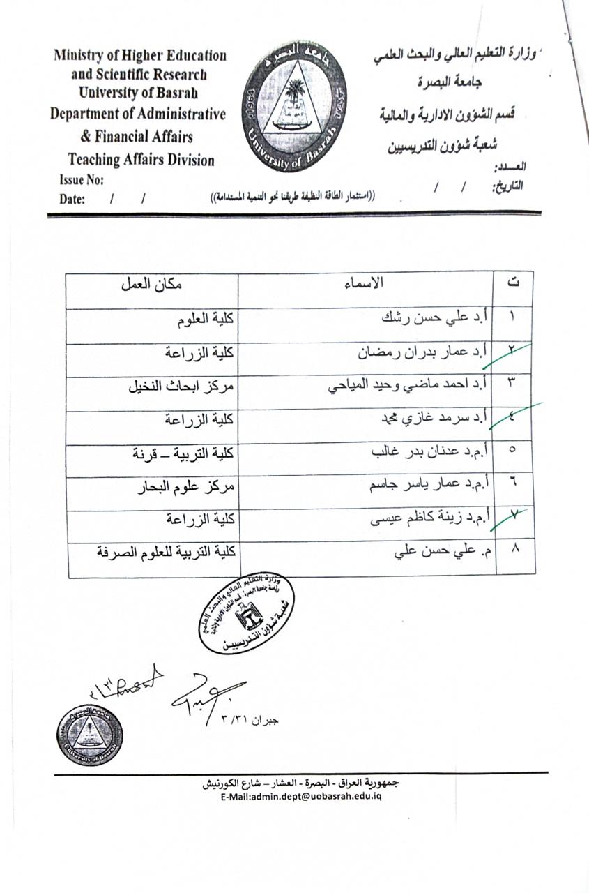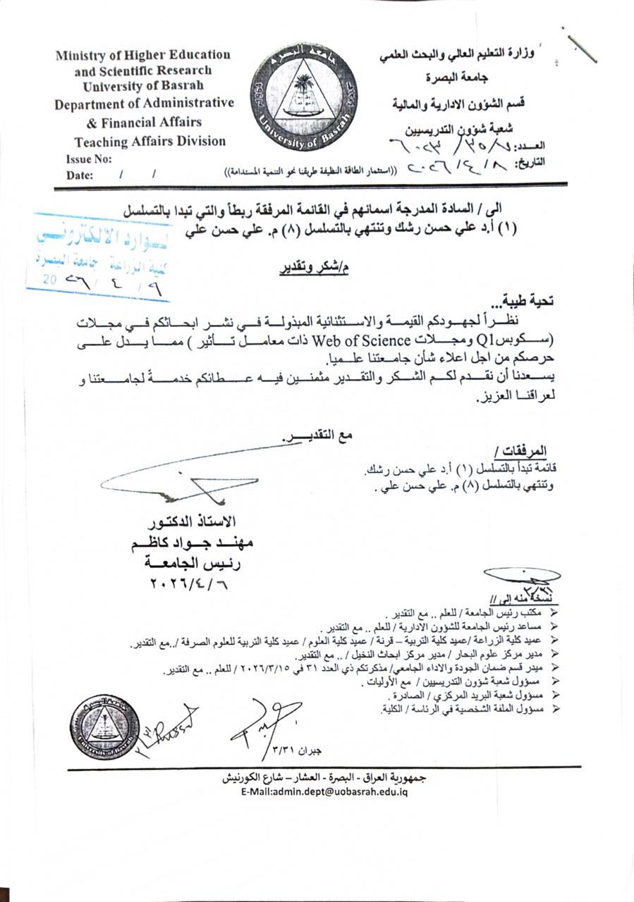حصل تدريسيون في كلية الزراعة بجامعة البصرة ، الاستاذ الدكتور سرمد غازي محمد والاستاذ الدكتور عمار بدران رمضان والاستاذ الدكتور زينة كاظم عيسى ، على كتاب شكر من قبل السيد رئيس جامعة البصرة الاستاذ الدكتور مهند جواد كاظم ، تقديراً لجهودهم المبذولة في نشر ابحاثهم في مجلات سكوبس Scopus-Q1 ومجلات Web of Science ذات معامل تاثير .