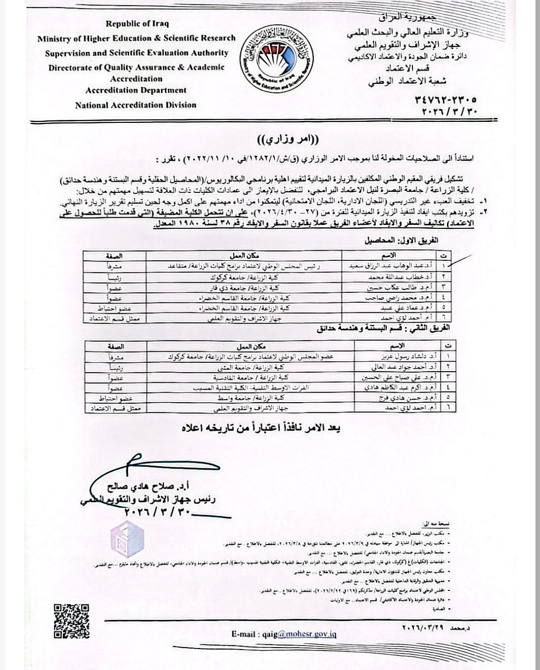 في إطار سعي كلية الزراعة في جامعة البصرة لتعزيز جودة برامجها الأكاديمية والحصول على الاعتماد البرامجي، وبالإشارة إلى الأمر الوزاري المرقم ٢٣٠٥ - ٣٤٧٦٢ في ٣٠/ ٣ / ٢٠٢٦ ، المتضمن تشكيل فريقي مقيمي برامج كليات الزراعة، زارت اللجان الوزارية المختصة لكلية الزراعة في جامعة البصرة ، لغرض تقييم برنامجي البكالوريوس في قسم البستنة وهندسة الحدائق وقسم المحاصيل الحقلية، واستكمال متطلبات منح الاعتماد البرامجي.